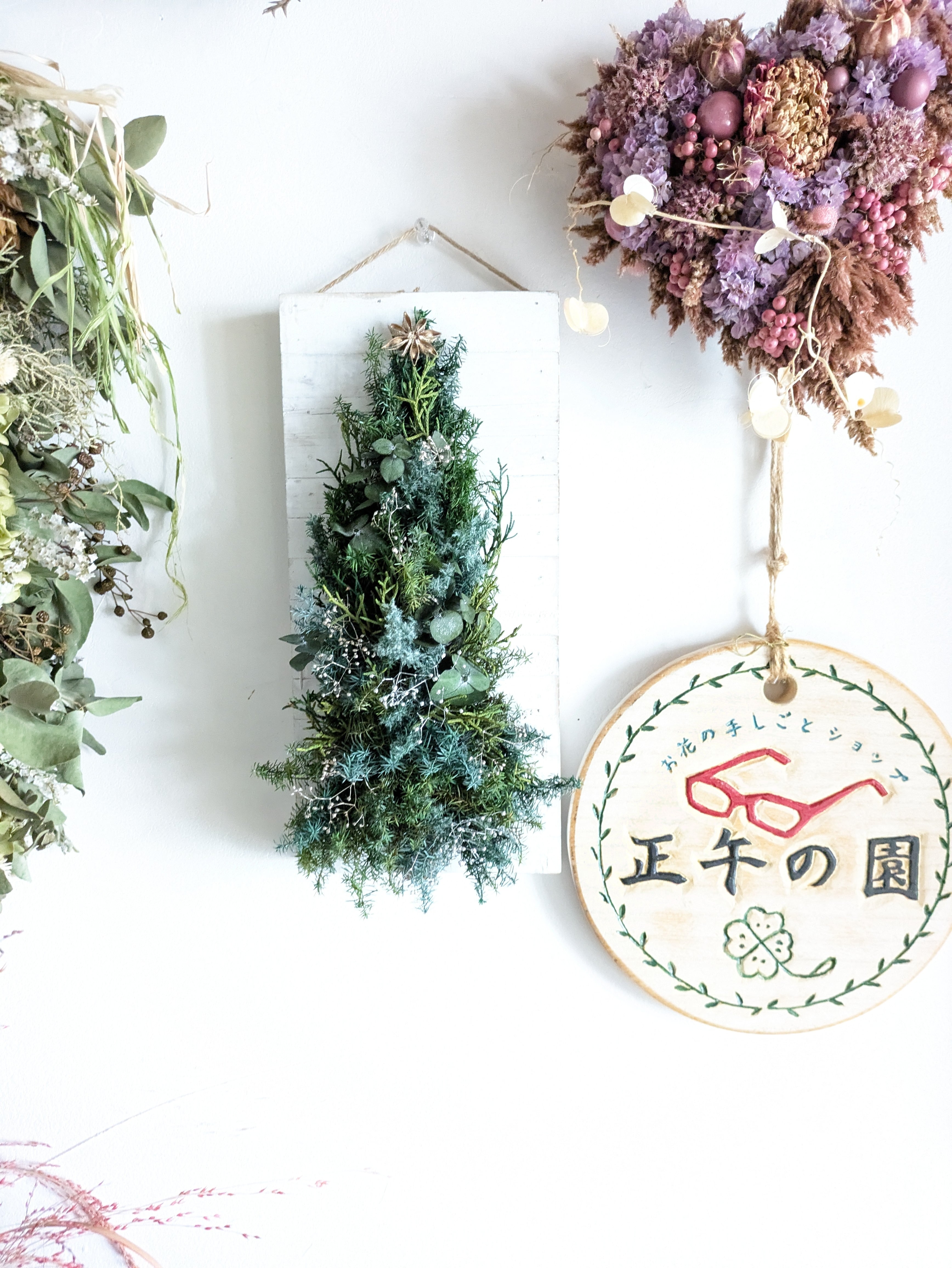 約10cm×20cmの白塗りの板に、コーン型オアシスベースを貼り、木の香り残るエバーグリーンのプリザーブドグリーンと木の実やワイヤーピックを使用してミニツリーの壁飾りを作りました。壁掛け用に裏側に麻紐が付いています。